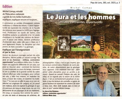 Pour rappel, Michel Campy, géologue reconnu, est l’auteur avec Vincent Bichet de l’ouvrage de référence sur la géologie du Jura, Montagnes du Jura. Géologie et paysages, paru en 2008.